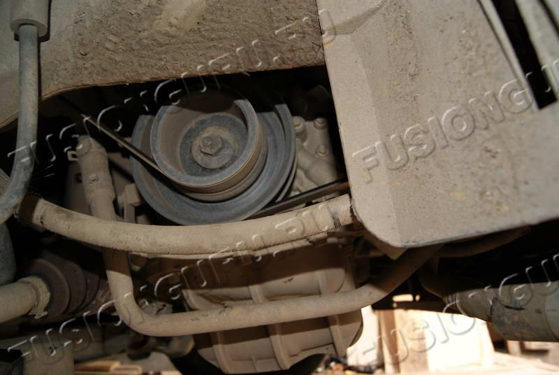 Слез в яму и открутил пластмассовый щиток закрывающий ремни агрегатов снизу. Предварительно срезал ножом крепёж шланга, который закреплён на этом щитке.