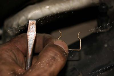 Свёл усы на ролике, сжимая пружину, усилием пальцев одной левой. Правой рукой снял ослабший ремень. Всё очень просто.