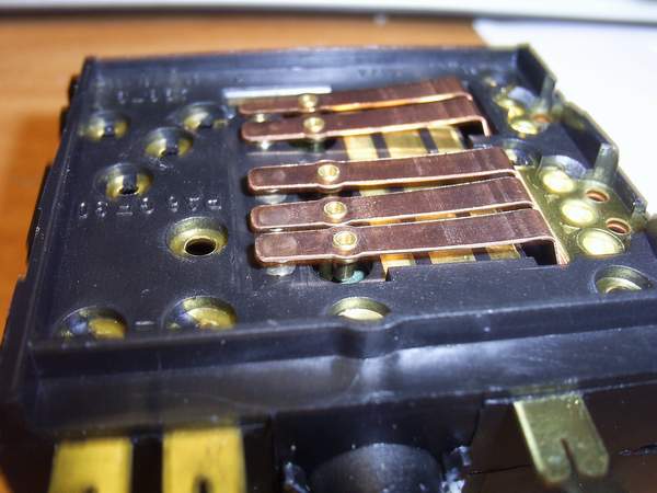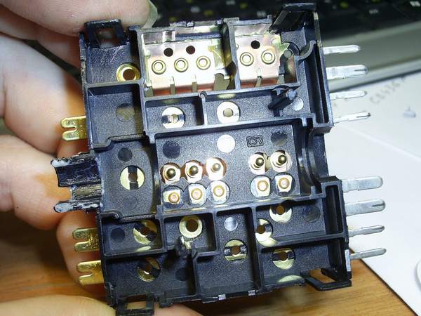 Тоже составной элемент. Зеленые половинки - это то самое, что не дает нам крутить ручку за пределы допустимых положений. Оно же не дает включить ПТФ, если не включены габаритки. Оно же заставляяет выключить ПТФ, если мы выключаем габариты. Собственно это направляющие