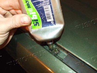 Удивляемся, что всего на 5 мм ошибка в расчётах, надрезаем резинку со слоем двустороннего скотча, видим (подразумеваем) залитый герметиком и закрашенный винт с внутренним крестом, расковыриваем герметик.
