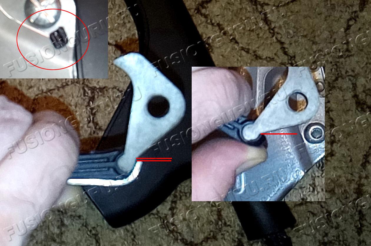Снять пластик ручки нам мешают 4 зацепа на металле, выдавленные изнутри. Я просто расковырял там отверткой пластик, без фанатизма, но чтобы придать ускорение при съеме. Защелки, которые держат рукоять и основной пластик особо не упираются, но можно и там что-нибудь пошевелить, по фантазии :).