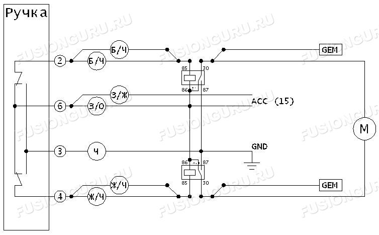 При включенном зажигании на обоих полюсах мотора висит +12. При включении переднего омывателя на один полюс приходит "земля", мотор крутится в одну сторону и гонит воду на лобовое. При включении заднего — на другой, мотор крутится в другую и гонит воду на заднее. При включении обоих (механически это НЕ заблокировано!) — все отдыхают.