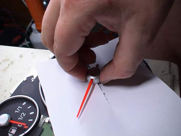 Прежде, чем снять стрелку, надо пальчиком вывести ее в максимально нижнее положение. То есть "зашкалить" ее за ноль до упора и маркером поставить отметку положения стрелки
