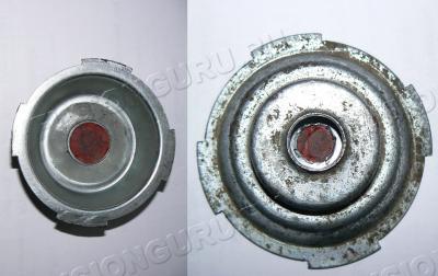 В передней крышке нам нужно сделать посадочное место для подшипника. Лепестковую шайбу, запрессованную в крышку, выкавыриваем (аккуратно вытащить у меня не получилось). Берем большое (внешнее) кольцо разобранного подшипника и лепим к ней при помощи детского пластилина шайбу чуть-чуть меньшего диаметра