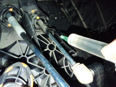 Заливал также сверху, но трансмиссионка это вам не бензин, и не силиконовая смазка , которую льют некоторые товарищи в тросы. Трансмиссионка она гуще, она еле через толстую иглу шприца проходит.