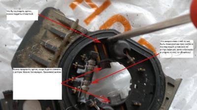 Далее необходимо снять саму пластиковую деталь с ротора, на фото показано стрелочками щетки они прижимаются пружинками к ламелям (по моему так это называется) якоря ротора. Короче говоря их нужно шилом утопить внутрь чтобы сдвинуть пластиковую деталь со своего места. Делал я это, поочередно, сперва утопил одну щетку, затем другую. И постепенно не спеша снял ее с ротора. Также на фото указано, как шилом поддеть гнездо щетки (выглядит, как медная "коробочка" в которой и ездит под воздействием пружинки туда-сюда щетка.) Вообщем поддеваем шилом эту медную фиговину и вынимаем ее из паза. К стати разгибая, фиксаторы пружинок (поймете про что говорю, когда извлечете) при замене на исполнительном механизме выжима сцепления я ее сломал, лечится паяльником и оловом (ОНО ЖЕ МЕДНОЕ!!!), и затем подточил напильником. Держит лучше прежнего.