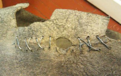 Шилом накаленным на огне наделал дырок и двойной аллюминиевой проволокой сшил надрывы где были.
