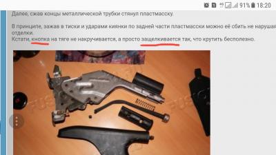 Хотя чел по моей ссылке вытягивал полностью весь поводок, преодолевая усилия. А потом мучился, устанавливая болт вместо заклёпки. А это, я вам скажу, не просто, так как пластик закрывает отверстие почти полностью. И на храповик надо попасть, короче попа такой вариант. Перечитал еще раз этот способ и понял, что пластик он скидывал лишь для того, чтобы высверлить заклепку. Ведь вытаскивая и вставляя поводок через нос и ручку, снимать ничего не надо. Выдернул - вставил. Но угол у поводка крутой, чтобы по прямой его туда-сюда таскать, лопнуть может.