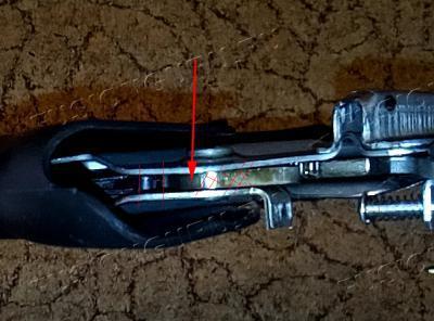 На фотке между линиями внутри сломанный конец поводка. Конец храповика, который туда будет вставляться, по стрелке вообще не видно внизу. И в таком положении надо завернуть болт, ловя отверстия.