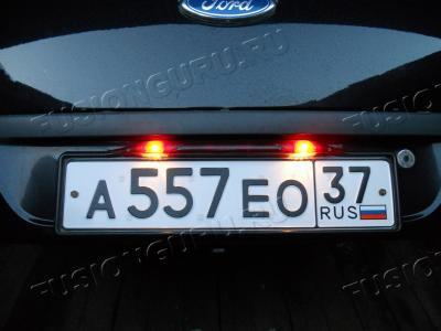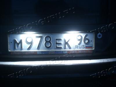 В начале зимы заказал из Китая светодиодную подсветку номерного знака как раз для Фьюжика. До этого пробовал ставить туда светодиодные лампы, но что из этого получилось, см. фото ниже. В итоге сейчас подсветка стала гораздо лучше и никаких проблем.