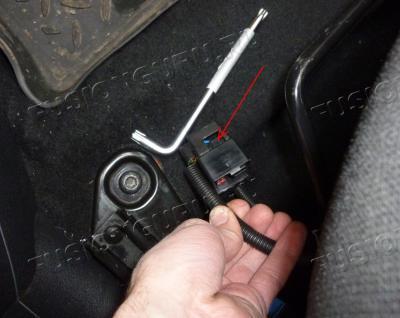Сначала нужно отсоединить разъём находящийся под креслом. Для этого нужно нащупать пальцем на разъёме кнопочку (указана красной стрелкой на фото1). Нажимаем её и покачивая тянем разъём вперед. (Конечно ключ зажигания должен быть вынут (блок SRS не работает при выключенном зажигании), на всякий случай можно вытащить предохранитель подушек безопасности или снять клемму с аккумулятора, но я этого не делал