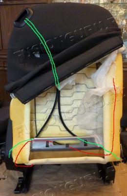 Начинает показываться арматура спинки. На фото6 вид сзади, зеленым - как проходят тросики от ручки складывания спинки до механизмов по бокам снизу, красным - как проходит провод к боковой подушке.