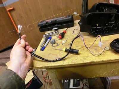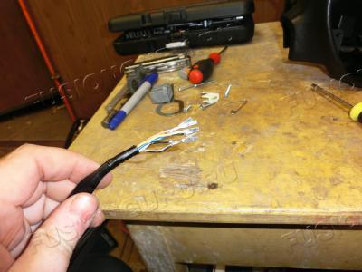 Разделываем его и вынимаем провод для повторителя и массу, так как масса имеет раздвоение, то чтобы его не потерять, выплетаем из жгута.