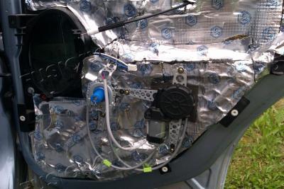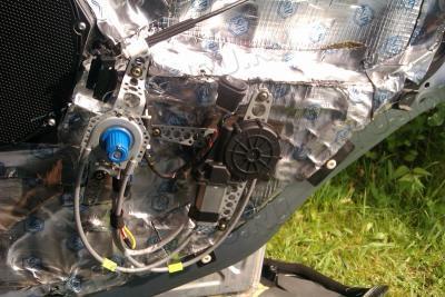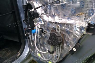 3. На оси стеклоподъемников установлены и закреплены пластмассовые шестеренчатые втулки. На внутренней стороне дверей установлены и закреплены саморезами электроприводы. Подключены электрожгуты. Установлены обратно акустические головки.