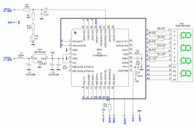 Вольтметр собран на микроконтроллере (м/к) Atmega-8. Данный м/к бывает в корпусе TQFP и PDIP. Я использовал корпус PDIP. Мне не нужна была миниатюризация поэтому использовал обычные классические радиодетали. Вольтметр состоит из двух плат. На одной сама схема с м/к, на другой индикатор. Так удобно потому что между собой платы соединяются через разъём (BH14/IDC14) при помощи плоского кабеля и можно использовать семисегментные светодиодные матрици как с общим анодом так и с общим катодом в любом типоразмере. Данный тип решения даёт свободу в плане использования любых матриц так как может понадобится изменения схемы индикатора если он например: будет очень мощная матрица, люминесцентный индикатор, матрица с другой цоколёвкой, то всегда можно подкорректировать только плату индикации.
