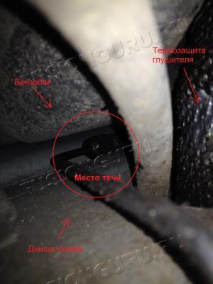 Обнаружилась течь из магистрали тормозной системы, точнее не из самой магистрали, а из одного из соединений. Располагается это соединение в очень неудобном месте (см. фотографию) - на дне узкой щели между днищем кузова и бензобаком да ещё и прикрыта термозащитой глушителя и самим глушителем. Добраться до соединения не получается даже рукой.