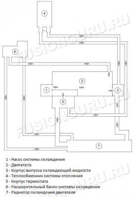Холодная жидкость выходит из корпуса выпуска ОЖ (№3 на рисунке). Входит в нагреватель, нагревается, выходит из нагревателя и входит в радиатор салонной печки (№4).