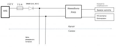 Вследствие того, что уже пару раз приходилось снимать аккумулятор и тащить его на зарядку, решил, на всякий случай, подключить цепь резервного питания (см. схему). Вывел провода в салон и подключил согласно схеме. На всякий случай уточню, что цепь питания запитывает ИММО, а не сам привод замка капота, таким образом, авторизацию владельца никто не отменяет :)