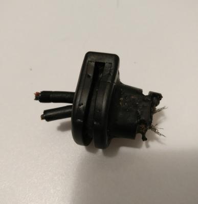 Напоминает "прокладку" или вставку в конце провода в вилке, два провода по 2 жилы, коричневый и черный, кабель сталь или типа того (не медь).
