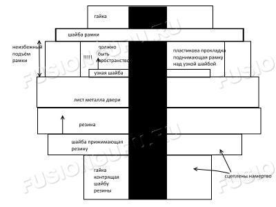 Узкая гайка нужна чтобы винт не вывалился внутрь когда рамка снята. Под узкую гайку положу пару листов изоленты чтобы не царапать дверь. Узкую шайбу завинчу до упора - шпилька будет довольно прочно стоять даже за счёт неё.
