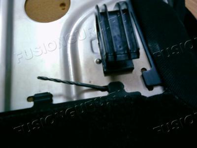 И уже начал думать, что здесь отвертка бы очень помогла, ежели надавить изнутри. Но в конечном итоге спасло меня опять же то, что отвертки не было, тем же сверлом, засунутым в направлении "к заду" сидушки, защелка довольно легко выпрыгнула (фото хреновое, но приглядевшись можно заметить сверло, находящееся параллельно металлу):