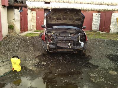 Причина акции - стал постоянно очень часто включаться карлсон, один раз чуть не закипел в пробке с включенным кондеем. Грязи вымыто немеряно, тыльная часть радиатора двигла была полностью залеплена чем-то типа глины, как будто специально кто-то замазывал. До "первозданного" вида отмыть не смог, между радиаторов еще немного осталось каки. Сто литров воды закончились