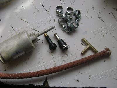 Компоненты пять винтовых хомутов, "Ашана - шланг"( на первой фоте не подошел), тройник, быстросъем от Казели и остатки Т/Ф