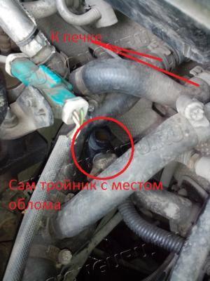 Правый патрубок от радиатора печки и вставляется в этот тройник,обломленный кусок остался в патрубке...