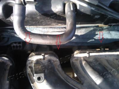 Для отодвигания коллектора мешают две резиновые трубки, которые мы смело снимаем, но помним о них: одна на обратке топливной рейки и вторая из БДЗ куда-то в блок двигателя